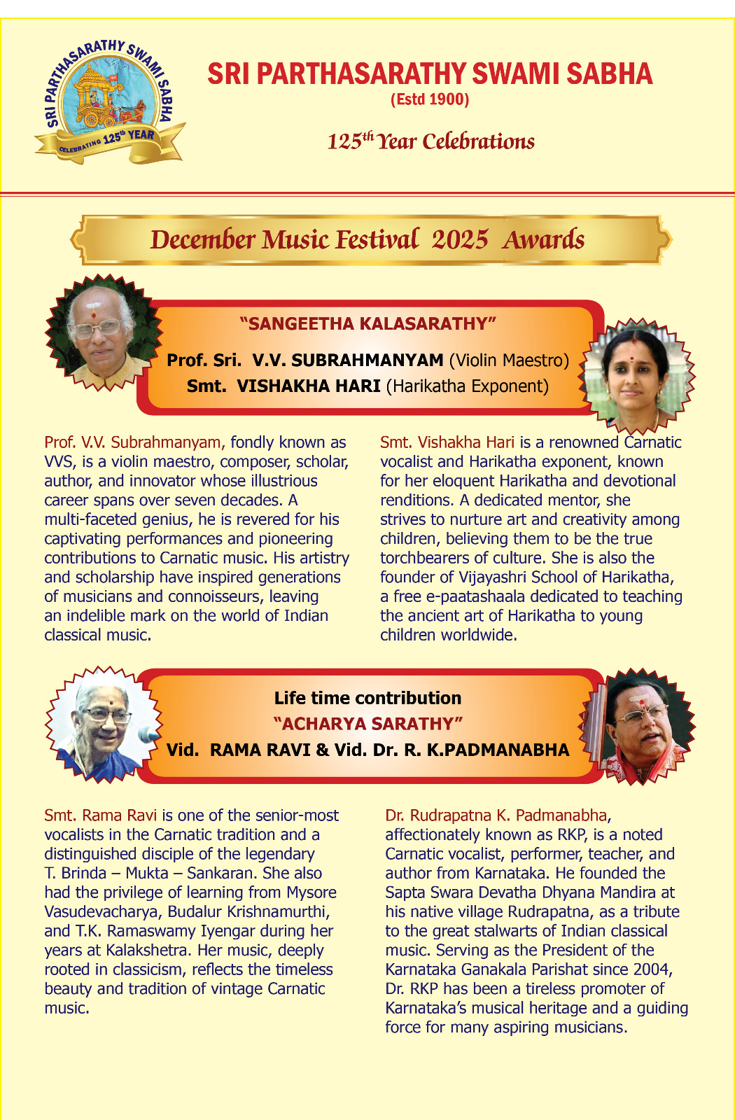 | December (Madras) Chennai Music Season Awards 2025 - 2026 * Bharat Kalachar DR. MRS YGP AWARD FOR CULTURAL EXCELLENCE - Vyjayanthimala Bali (at the birth centenary celebration of educationist Dr. YGP organized by Bharat Kalachar) ![]() * Brahma Gana Sabha Gaana Padhmam - Neyveli S.Santhanagopalan Vaadhya Padhmam - Mannargudi A.Easwaran Naatya Padhmam - Meenakshi Chitharanjan Naataka Padhmam - Mapillai Ganesh * Gayatri Fine Arts and Gayatri Fine Arts Global - Vishwa Sangeetha Seva Visharadha - V.V.Sundaram - Sangeetha Seva Visharadha - Subhasree Thanikachalam * Kartik Fine Arts - NADANAMAMANI - Deepthi Ravichandran (Bharatanatyam) - NRITHYA PEROLI - The Dhananjayans (Bharatanatyam) - ISAI PEROLI - J.A. Jayant (Flute) - NADHASWAROOPAM AWARD - Dr.R.Suryaprakash (Vocal) - NATYA CHUDAR - Sanjena Ramesh (Bharatanatyam) - Nrithyajyothi award of excellence in Bharatanatyam - Aishwarya.B (Bharatanatyam) - Natya Kala Arasi - Bala Devi Chandrashekar (Bharatanatyam) - Madurai Krishnan Memorial Honour 'Madura Kalamani' - V.Balagurunathan (Bharatanatyam) - Shri K.M. Narasimhan award - Parur M.K.Ananthalakshmi (dance accompanist, Violinist) - Kartik promising artiste award - P.Lekha, Sahana Selvaganesh, N.RM. Abirami, Saipriya Senthilvasan, Smrithi Vishwanath - Kartik Rajagopal Endowment Award for Best Cultural Organiser - G.Nagarajan (Sec., Chrompet Cultural Academy) ![]() * Lakshminarayana Global Music Festival Lakshminarayana International Award - A.R.Rahman * Mudhra ![]() * Nada Sudha - Nada Vallabha award - V.Rajkumar Bharathi (Vocal), T.V.Ramanujacharlu (Violin), Trichur C.Narendran (mridangam), D.Balakrishna (Venna) - Meritorius Service in Fine arts award - Mudhraa Bhaskar and Radha Bhaskar - Nada Pallava awards to young talented artists * Sri Krishna Gana Sabha SANGEETHA CHOODAMANI - K.V.Prasad (Mridangam) NRITHYA CHOODAMANI - G Narendra (Bharatanatyam) * Sri Parthasarathy Swami Sabha ![]() ![]() SANGEETHA KALASARATHY - Prof. V.V. SUBRAHMANYAM (Violin Maestro), VISHAKHA HARI ( Harikatha Exponent) Lifetime contribution ACHARYA SARATHY - RAMA RAVI, Dr. R. K. PADMANABHA Palghat Mani Iyer Centenary Award - T.G. MUTHUKUMARASAMY (Thavil) Dwaram Venkataswami Naidu Award - V.V.S. MURARI Gottuvadyam Narayana Iyengar Award for Musical Excellence - NIRMALA RAJASEKAR Veena Pichumani Iyer Centenary Award - Mudikondan S. N. RAMESH Kalpagam Swaminathan Award - MANGALAM SHANKAR Pudukkottai Dakshinamurthy Pillai Award - M. MANOJ SIVA (Mrudangam), B. GANAPATHY RAMAN (Mrudangam) Isai Methai G. Ramanathan Award - VIDYA KALYANARAMAN Dr. M.L. Vasanthakumari Award - SHRUTHI SHANKAR KUMAR * Sri Thyaga Brahma Gana Sabha ![]() * Tamil Isai Sangam Isaiperaringnar - Chitra Visweswaran (Bharatanatyam) Pann Isaiperaringnar - Kudandhai V.Lakshmanan * The Music Academy Sangita Kalanidhi - R.K.Shriramkumar (Violin) Nritya Kalanidhi - Urmila Satyanarayana (Bharatanatyam) Sangita Kala Acharya - Shyamala Venkateswaran (Vocal), Thanjavur R.Govindarajan (Tavil) TTK award - Madambi Subramania Namboothri (Kathakali Music), J.T.Jeyaraaj Krishnan and Jaysri Jeyaraaj Krishnan (Veena) Musicologist award - Prof. C.A.Sridhara Details |